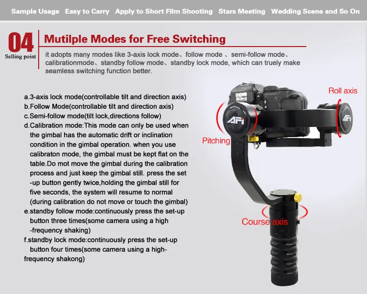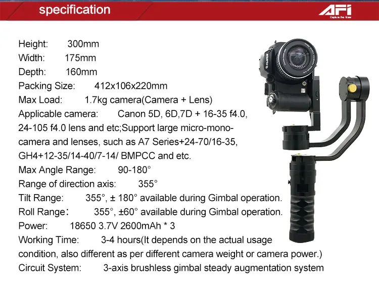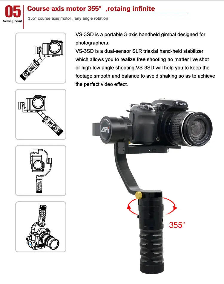 AFI VS-3SD Handheld 3-Axle Brushless Handheld Steady Gimbal Stabilizer for DSLR Cameras